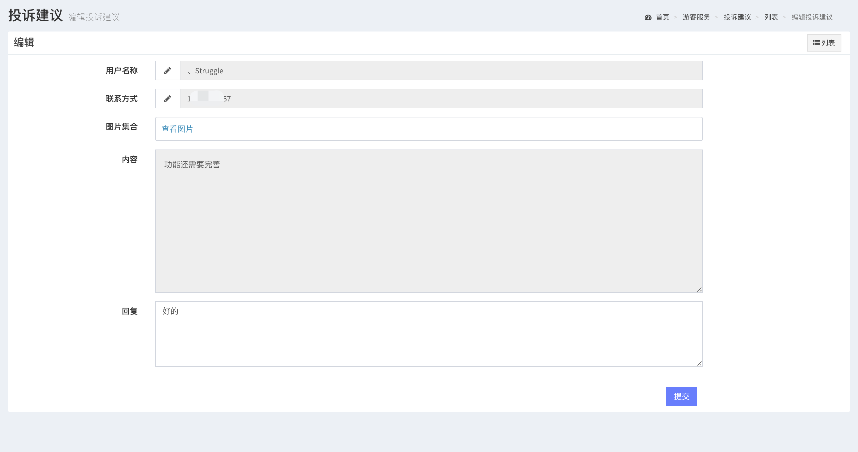 實現游客投訴建議移動端發布,景區管理人員后臺查看、處理并迅速作出回復。